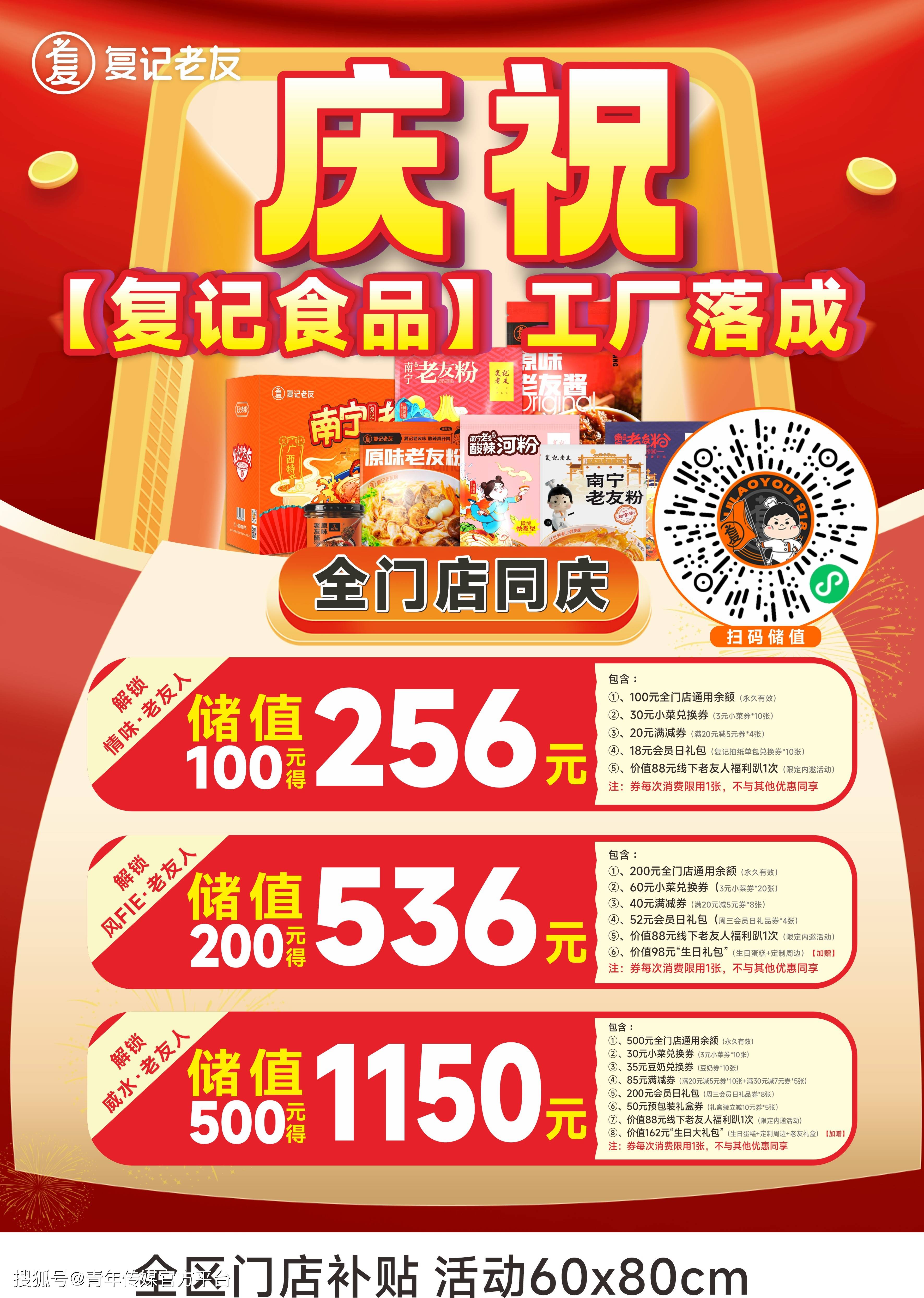 經(jīng)典產(chǎn)品:海報展示了復(fù)記食品的經(jīng)典產(chǎn)品,如老友粉、酸辣河粉及原味老友粉,吸引食客目光。